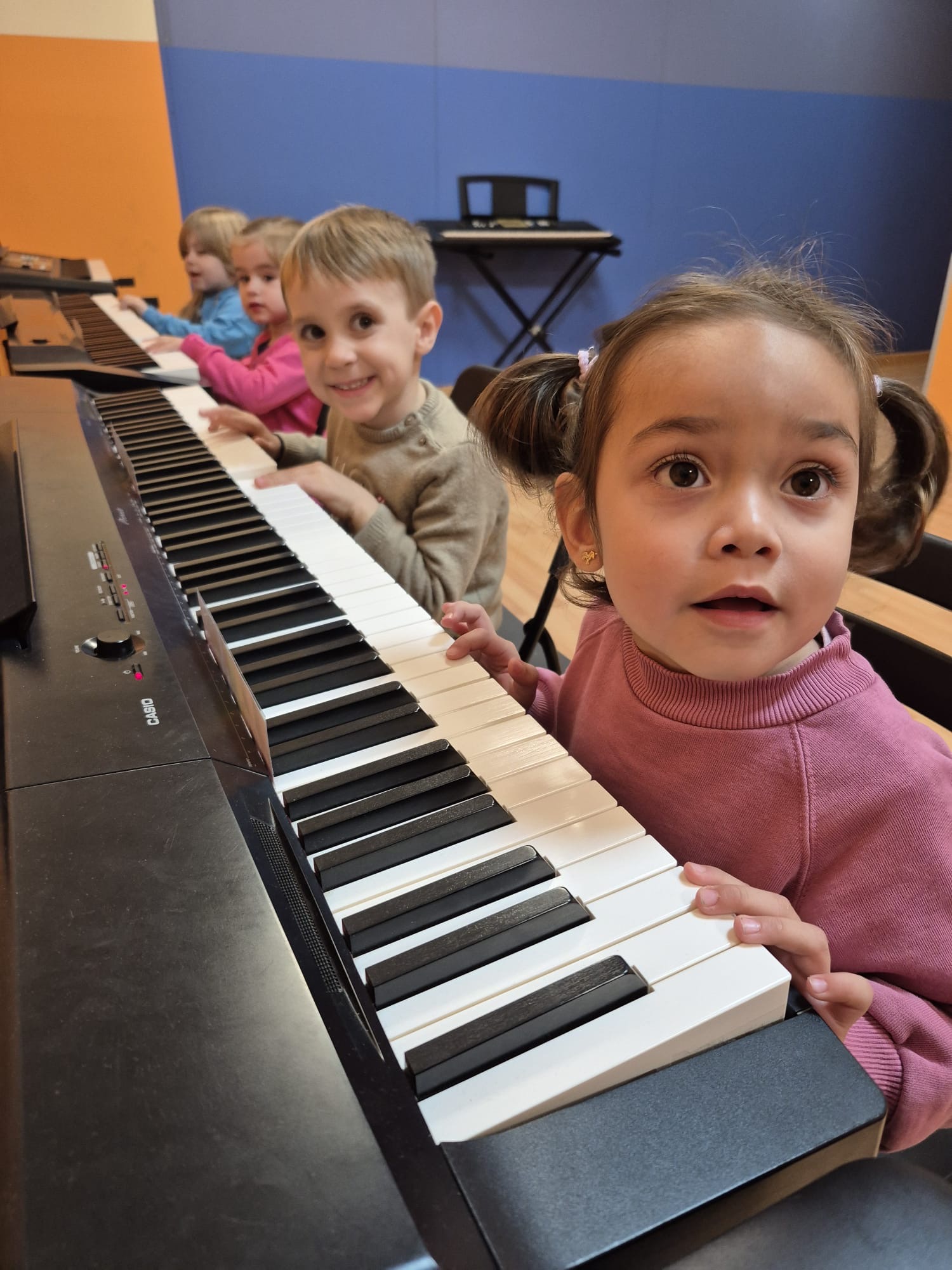 A medida que los niños crecen, el programa evoluciona hacia una iniciación musical más estructurada, introduciendo de forma natural conceptos musicales básicos, el contacto con los instrumentos y la participación en dinámicas grupales. Todo el proceso se desarrolla en un entorno seguro, estimulante y cuidadosamente planificado.